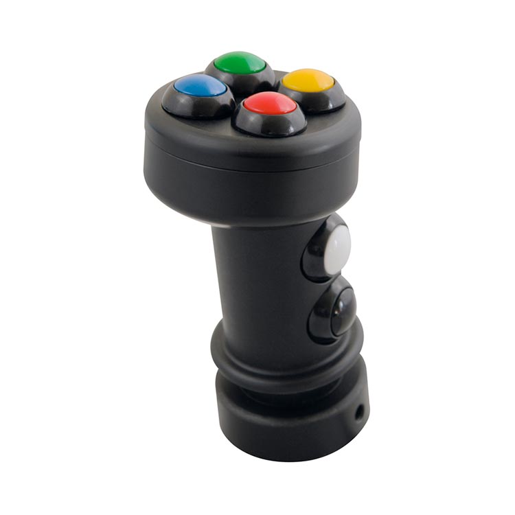 Compacta, foi desenhada para operação entre o polegar e o indicador ou com a mão inteira. Os quatro botões superiores são ergonomicamente inclinados para baixo e os dois botões inferiores podem ser montados à esquerda, direita ou à frente.